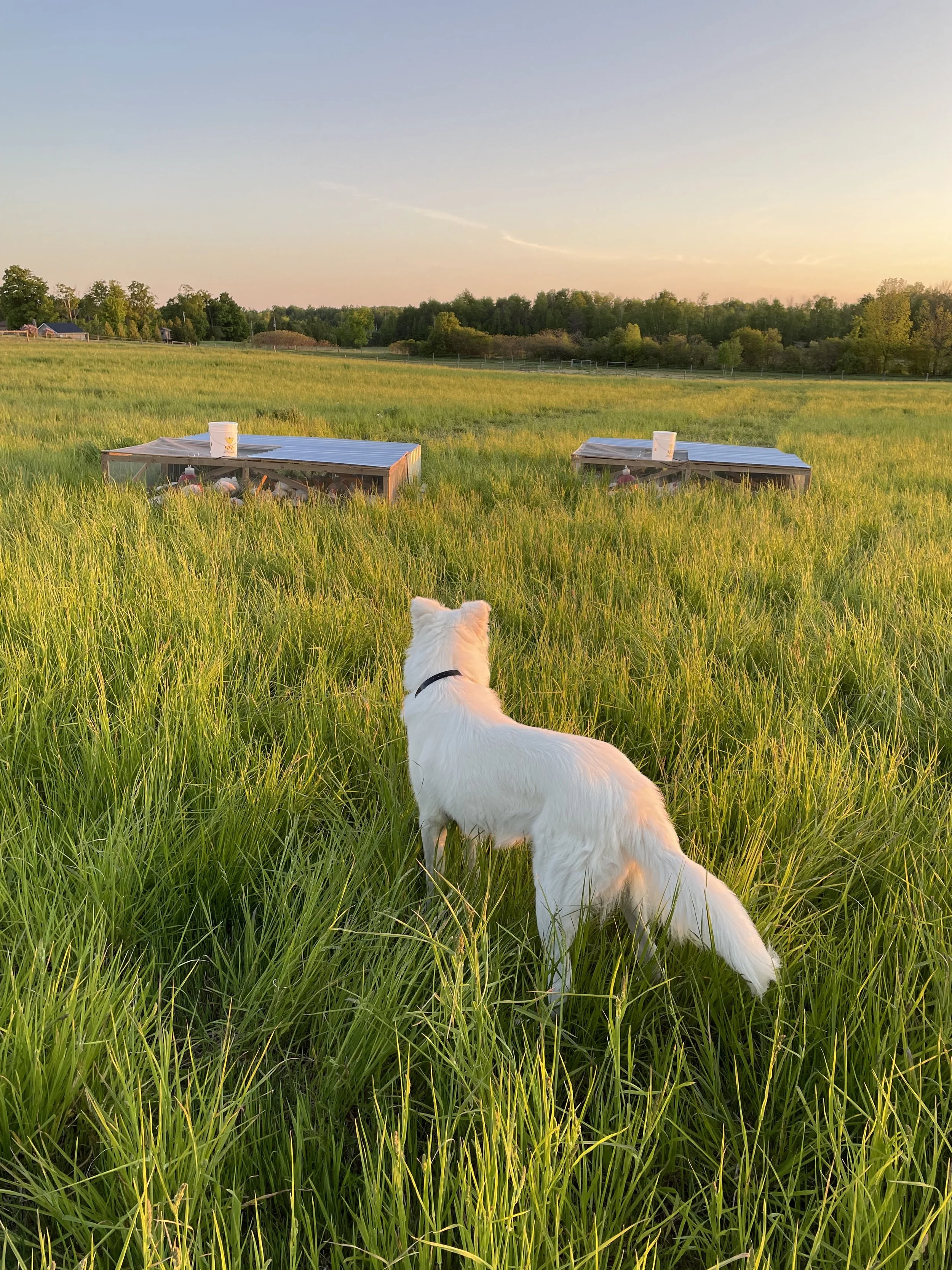 This season we also got a new farmhand: Kuma. We picked up this mixed Great Pyr Pup from Whitby Animal Services back in January and could ask for a better dog. He’s really taken to the farm, always wanting to be outside and up for choring. His guard dog instincts are already starting to show, as he patrols areas of the farm keeping an eye on us and the livestock. He’s the supervisor we didn’t know we needed.